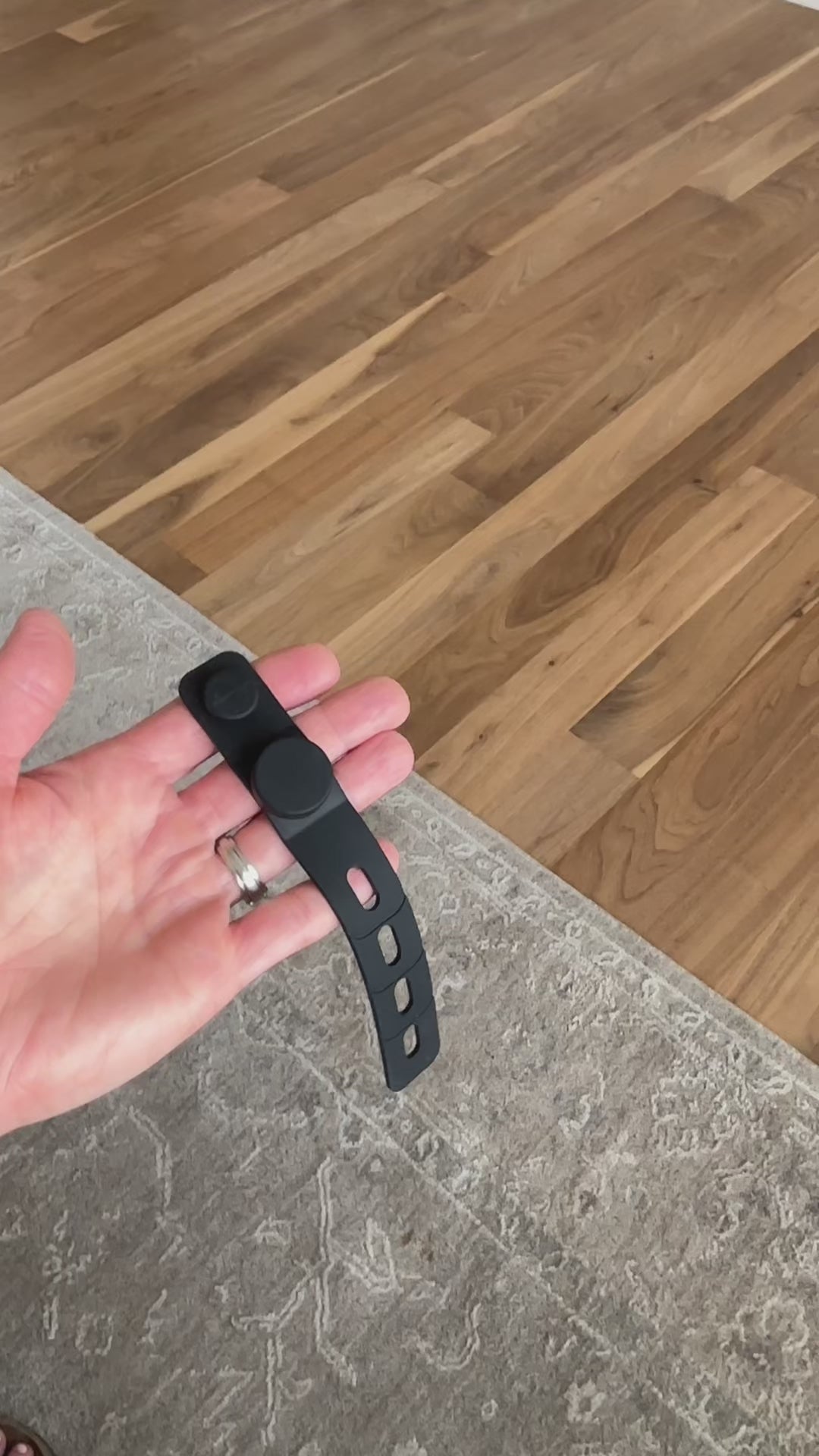 The silicone strap wraps securely around any broom or mop handle and snaps to the Stow rack with a built-in magnet. Simply trim at the perforated line for a clean, custom, and precise fit every time.