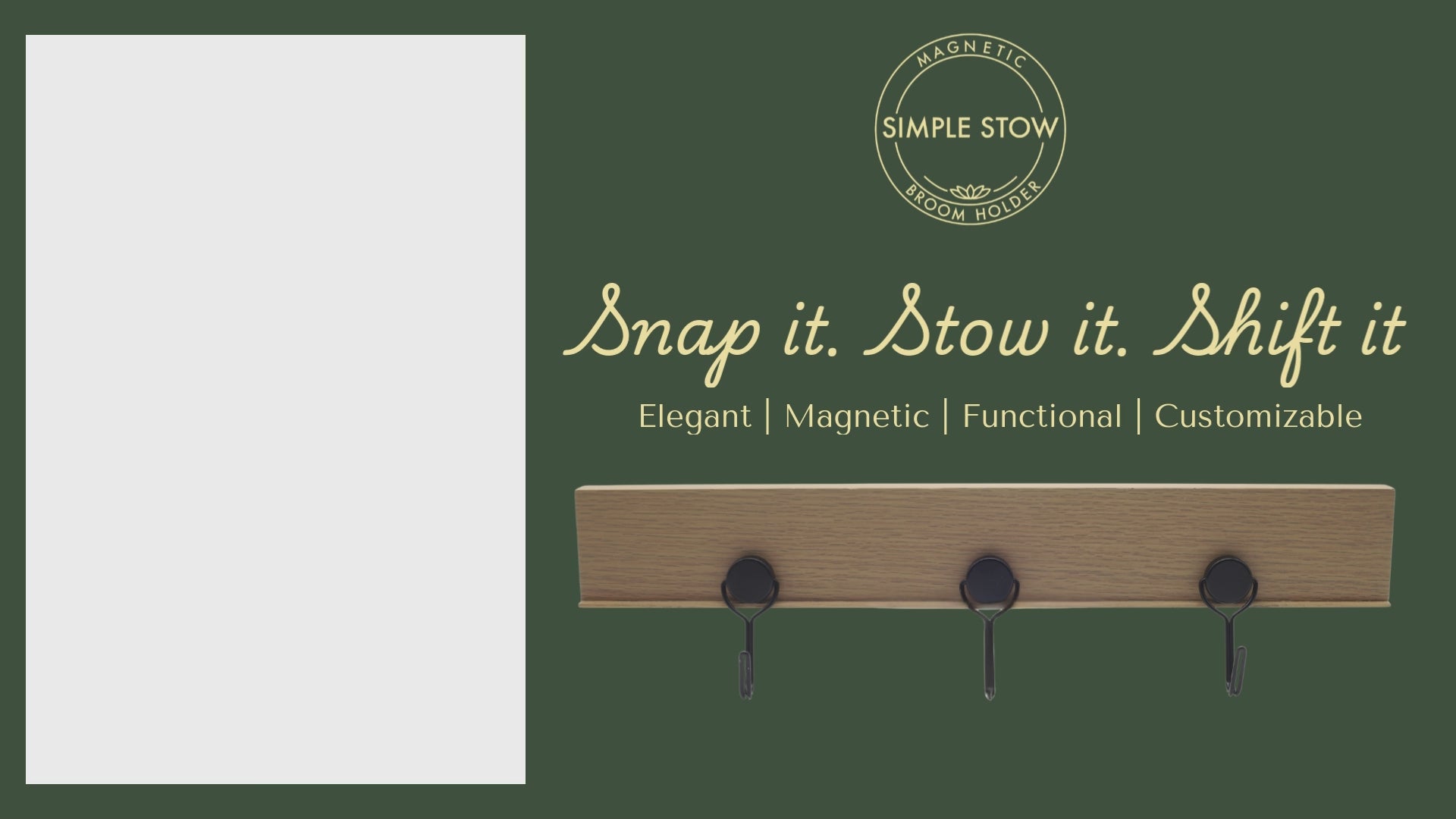 The Simple Stow broom and mop holder has 17 powerful magnets that form a customizable Snap-Lock grid. Each wooden hook or silicone strap snaps securely into place, offering flexible, clutter-free storage for all your brooms, mops, and other cleaning essentials.